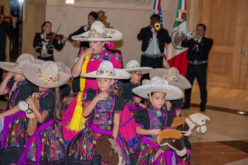 El festejo incluyó una amplia muestra del folclor mexicano, con presentaciones de grupos de baile que deleitaron al público con danzas típicas de diferentes regiones del país. El escenario también vibró con la música de mariachis, que interpretaron piezas emblemáticas que hicieron cantar y aplaudir a los asistentes.